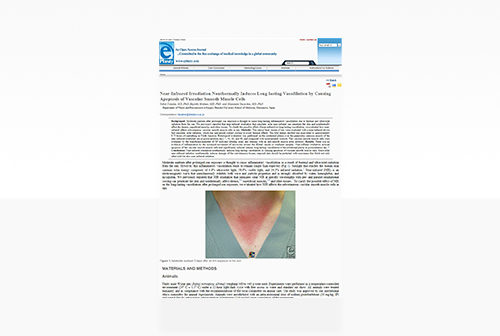 近赤外線照射により、血管平滑筋細胞がアポトーシスして、長期にわたって血管が拡張することを報告した論文。日に当たると皮膚が赤くなる理由を最初に示し、熱で温まって赤くなるのと違って近赤外線照射の場合は長期に及ぶこと報告した論文。