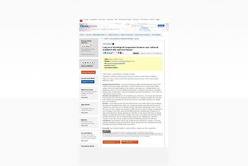 Tanaka Y, Matsuo K, Yuzuriha S. Long-term histological comparison between near-infrared irradiated skin and scar tissues. Journal of Clinical, Cosmetic and Investigational Dermatology 2010;3:143-9.近赤外線照射後の真皮ではⅠ型コラーゲンがⅢ型に比べて有意に増加し、瘢痕ではⅢ型コラーゲンがⅠ型に比べて有意に増加することを組織学的に証明し、適度な近赤外線照射は若返りに有効であることを報告した論文。